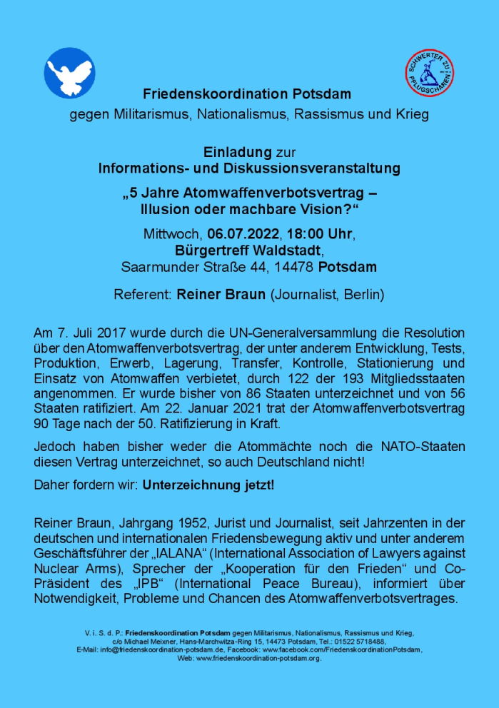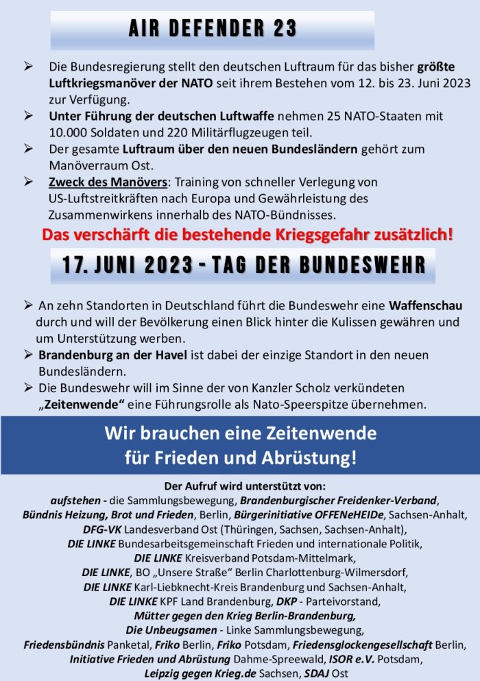 Die Friedenskoordination Potsdam setzt sich immer für friedliche Lösungen von Konflikten ein. Wir brauchen keine Kriege – wir wollen eine friedliche Welt!